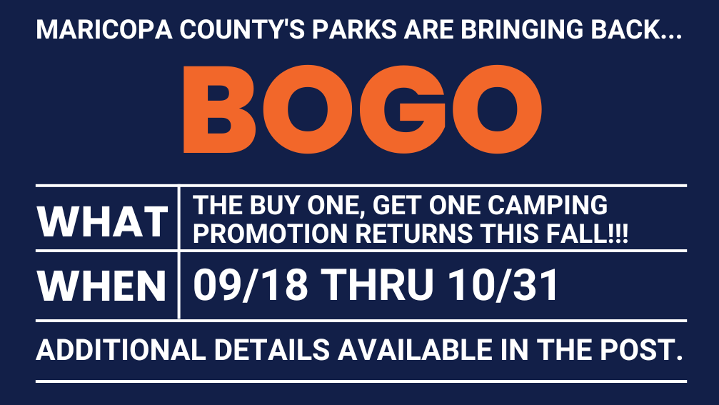 Interested in enjoying a free night at a Maricopa County regional park? Starting September 18, the Maricopa County Parks and Recreation Department is bringing back its popular “Buy 1, Get 1 Free” camping promotion! With this promotion, park visitors who pay for one or more nights of camping at participating Desert Mountain County Parks will […]